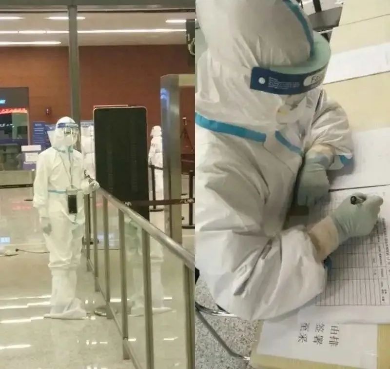伴着融融的暖阳,早晨八点他们准时坐班车从总关出发,前往沈阳桃仙机场。在到达机场后,他们迅速穿上防护服,戴好口罩、手套和鞋套,根据当天的情况,进行工作任务。第一次穿上防护服的不适应,闷热的环境,高强度的工作,长时间佩戴口罩而出现很深的压痕,长时间站立导致的身体不适,由于物资紧张而长时间佩戴带有滑石粉的一次性手套导致的过敏症状,这种种看似无法让人承受的困难,在他们面前虽也是高山,但却没有让我们的同学们退缩,他们没有一个人喊累,更没有一个人后退,他们以行动肩负起青年的责任,书写着沈医人的担当。