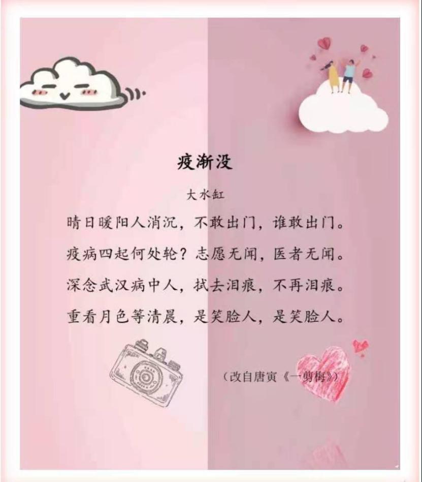 疫情面前,事无巨细。各班级班委协助辅导员工作,每日反馈同学身体状況,密切关心每位同学的生活状況和心理状态。做到及时发现,及时上报。闲暇时刻,我们集思广益,征集防疫标语,设计防疫海报。向所有在一线奋战的白衣天使们致敬.向所有在防疫一线的工作人员致敬,为武汉加油,为中国加油!